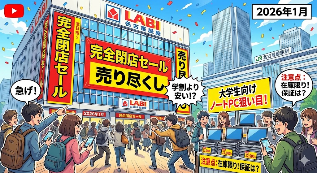 愛知・名古屋の「ヤマダデンキ LABI名古屋」は、店舗統合のため2026年2月1日をもって完全閉店予定で、店頭処分品の大放出をうたう“完全閉店セール”が告知されています。大学生なら、展示品・在庫処分でノートPCや周辺機器を相場より安く買えるチャンスになりやすいのがメリットです。