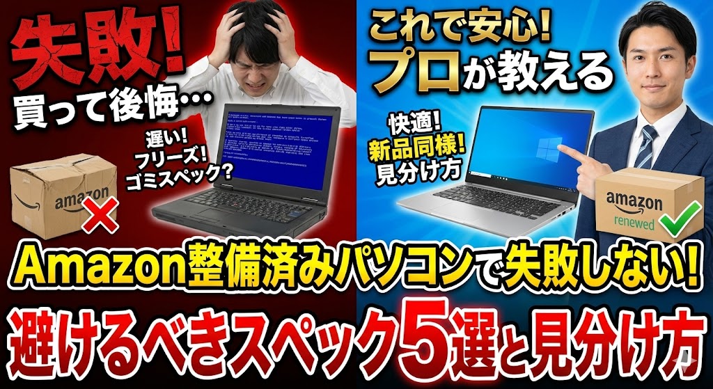この記事では、Amazon整備済み品(Amazon Renewed)で失敗しない選び方について、初心者向けに詳しく解説します。2〜4万円台でお手頃なAmazon整備済み品は魅力的ですが、知識なしに「値段」だけで選ぶと、「電源を入れてから起動するまで3分かかる」「ZoomとWordを同時に開くと固まる」といった「激遅PC」をつかんでしまう危険があります。