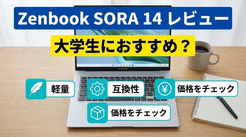 本記事では、Zenbook SORA 14レビューとして、大学生目線での使いやすさ、互換性、価格の見方、比較候補との違いをわかりやすく解説します。(専門知識は不要です!)