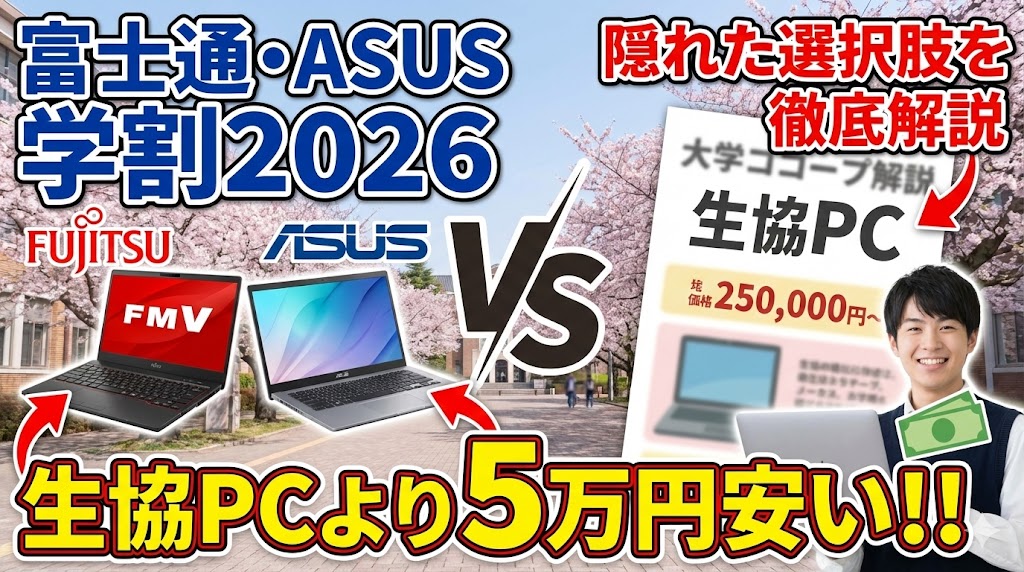 🎓 結論:「Apple・HPだけじゃない!」富士通・ASUSの『隠れ学割』で、生協PCより5万円前後安く(構成・時期で変動)、同等以上の性能+保証を手に入れられます。購入前に必ず公式サイトで最新のキャンペーン情報を確認しましょう(2025年12月時点の情報)。