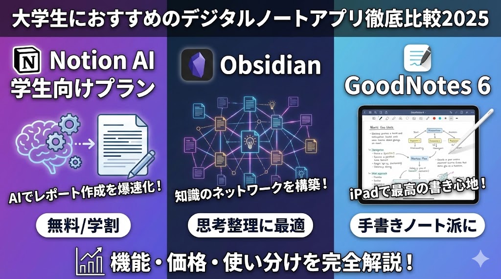 Notion AI学生向けプラン vs Obsidian vs GoodNotes 6、大学生におすすめのデジタルノートアプリ徹底比較2025