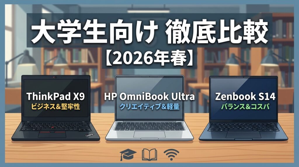 2026年春は、CES 2026で発表された新型ノートPCが実際に発売され始め、大学生にとっても選択肢が一気に増えた時期です。ThinkPad X9シリーズ、HP OmniBook Ultra、ASUS Zenbook S14はいずれも魅力的ですが、大学生にとって大切なのは「最新かどうか」より「4年間使って満足できるか」です。