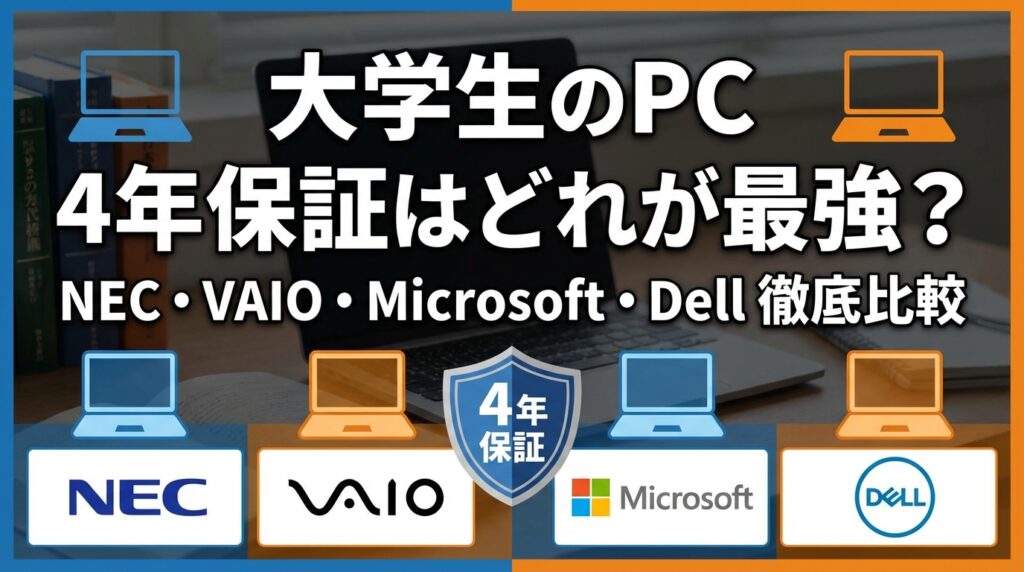 本記事では、大学生PCの4年保証比較をテーマに、NEC・VAIO・Microsoft・Dellの学生向け施策、保証年数、事故補償の違い、向いている人の考え方をわかりやすく解説します。(専門知識は不要です!)