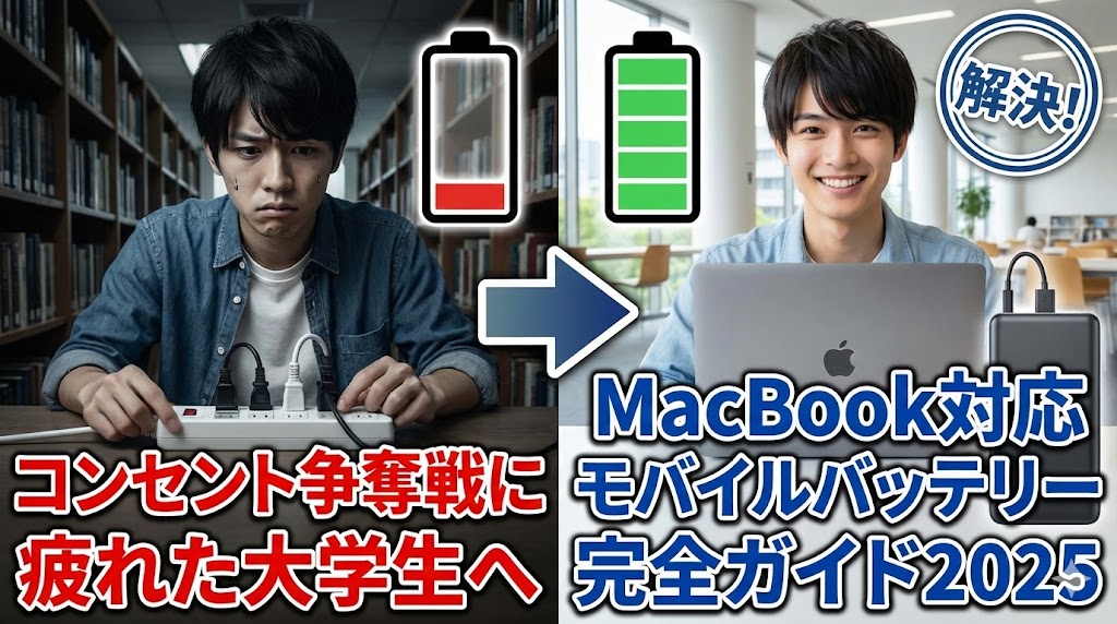 図書館でコンセント争奪戦に疲れた大学生へ|MacBook対応モバイルバッテリー完全ガイド2025