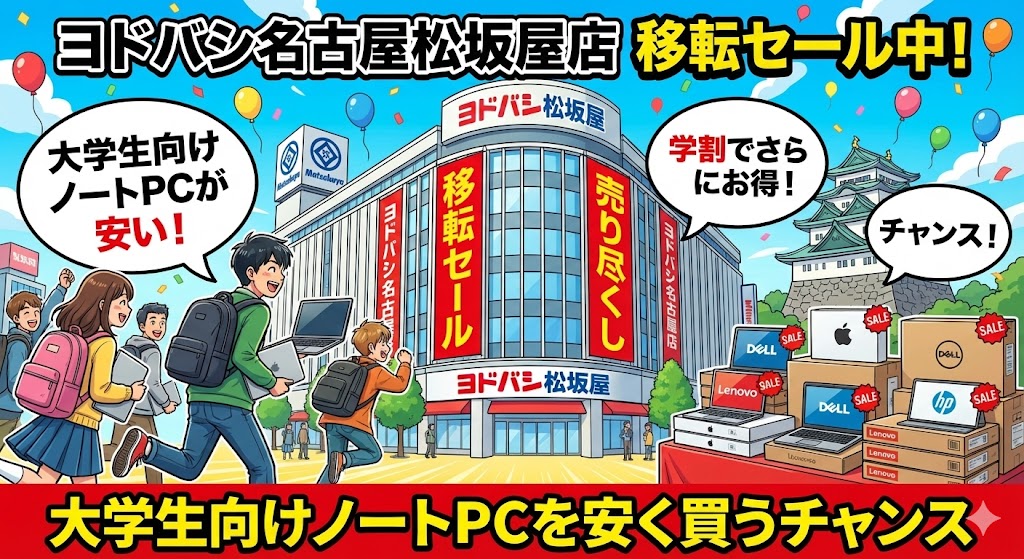 名古屋・栄エリアで大学生におなじみのヨドバシカメラ 名古屋松坂屋店が、2026年2月3日(火)に「サンシャインサカエ店」として移転オープンします。それに伴い、現在移転売り尽くしセールが開催中です。